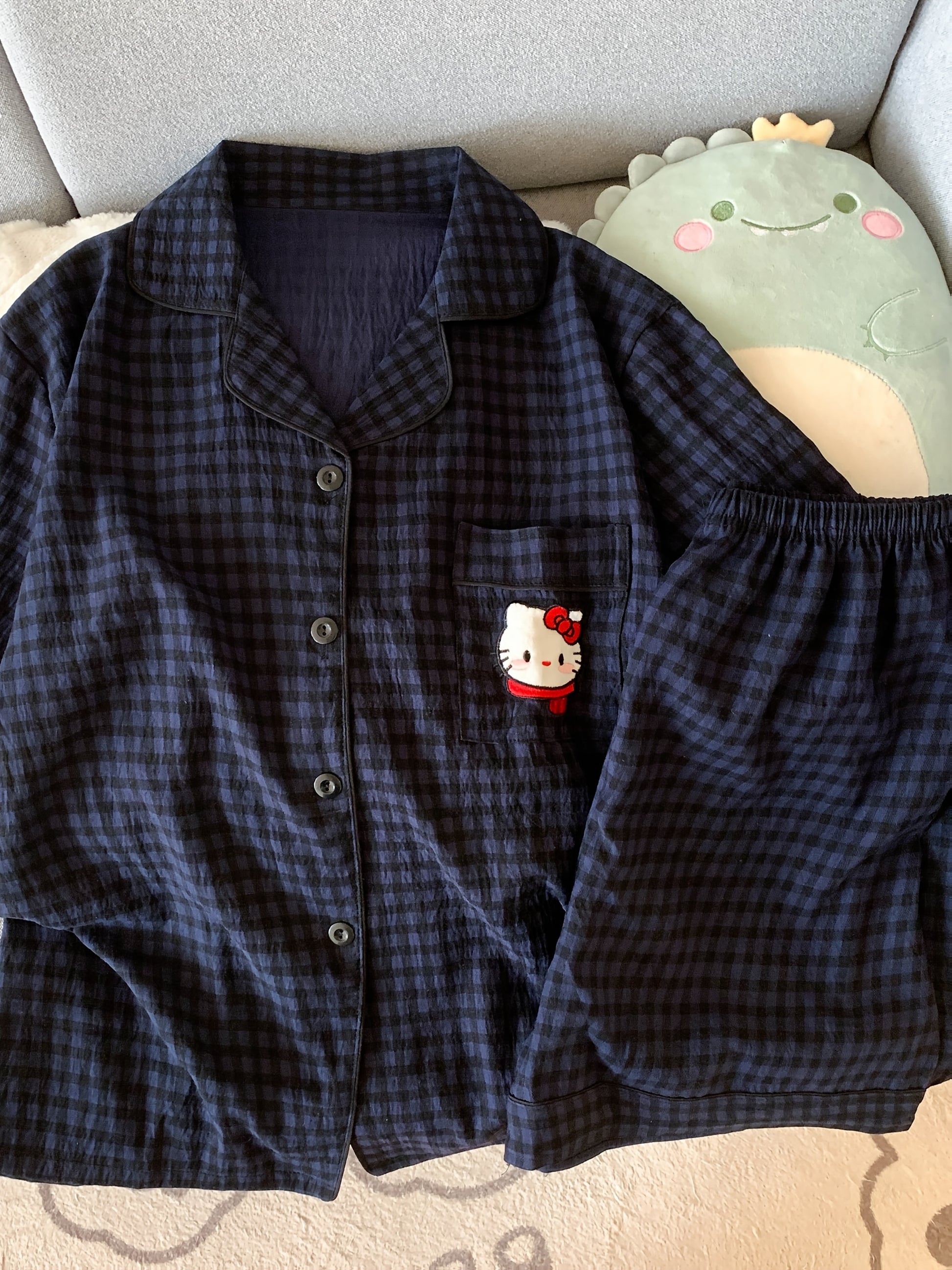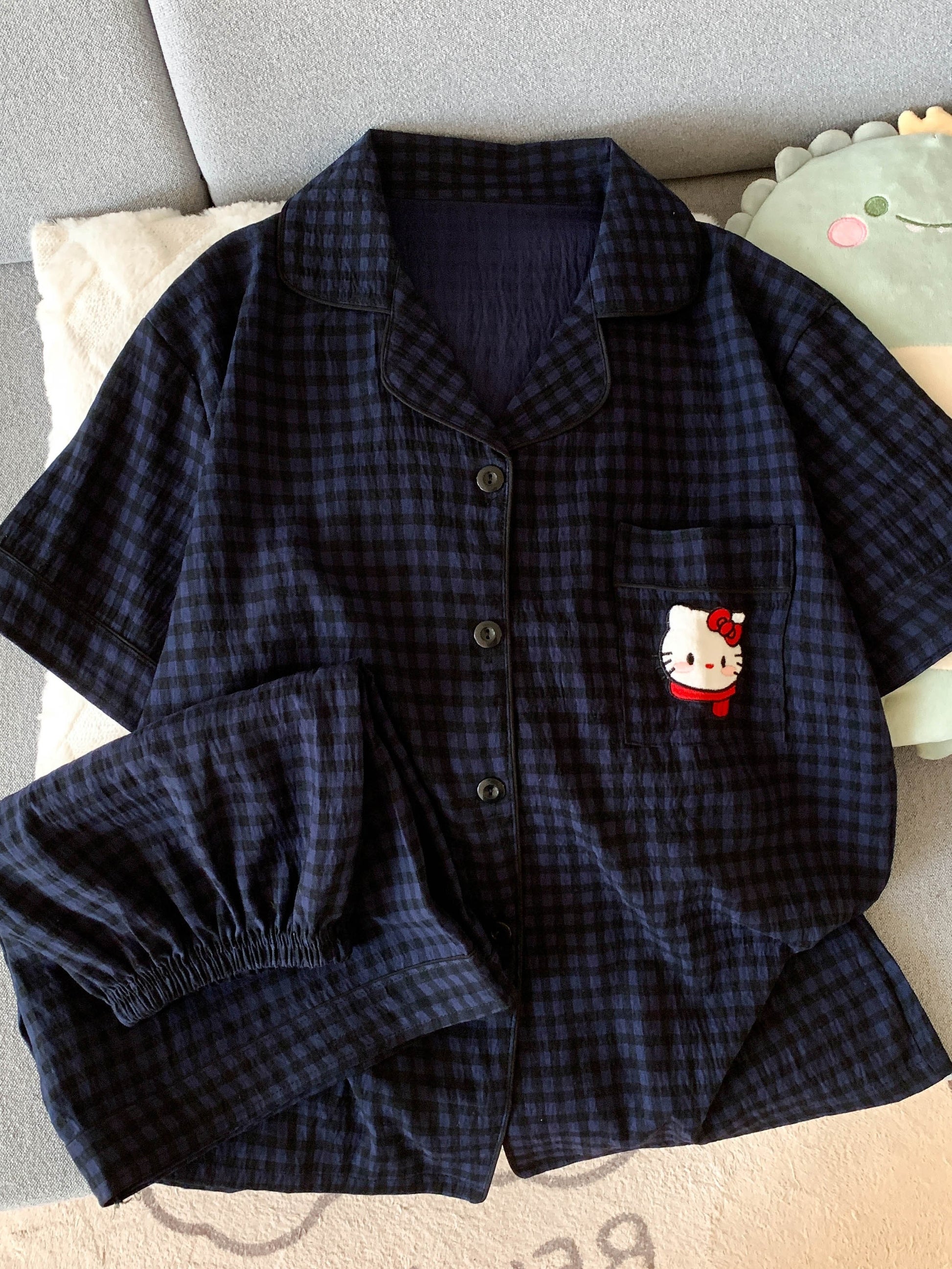 Stay cozy and stylish with this navy blue check pajama set featuring a cute Hello Kitty pocket detail. The set comes with a button-up short sleeve shirt and matching elastic waist shorts, designed for maximum comfort whether youβre sleeping or lounging.