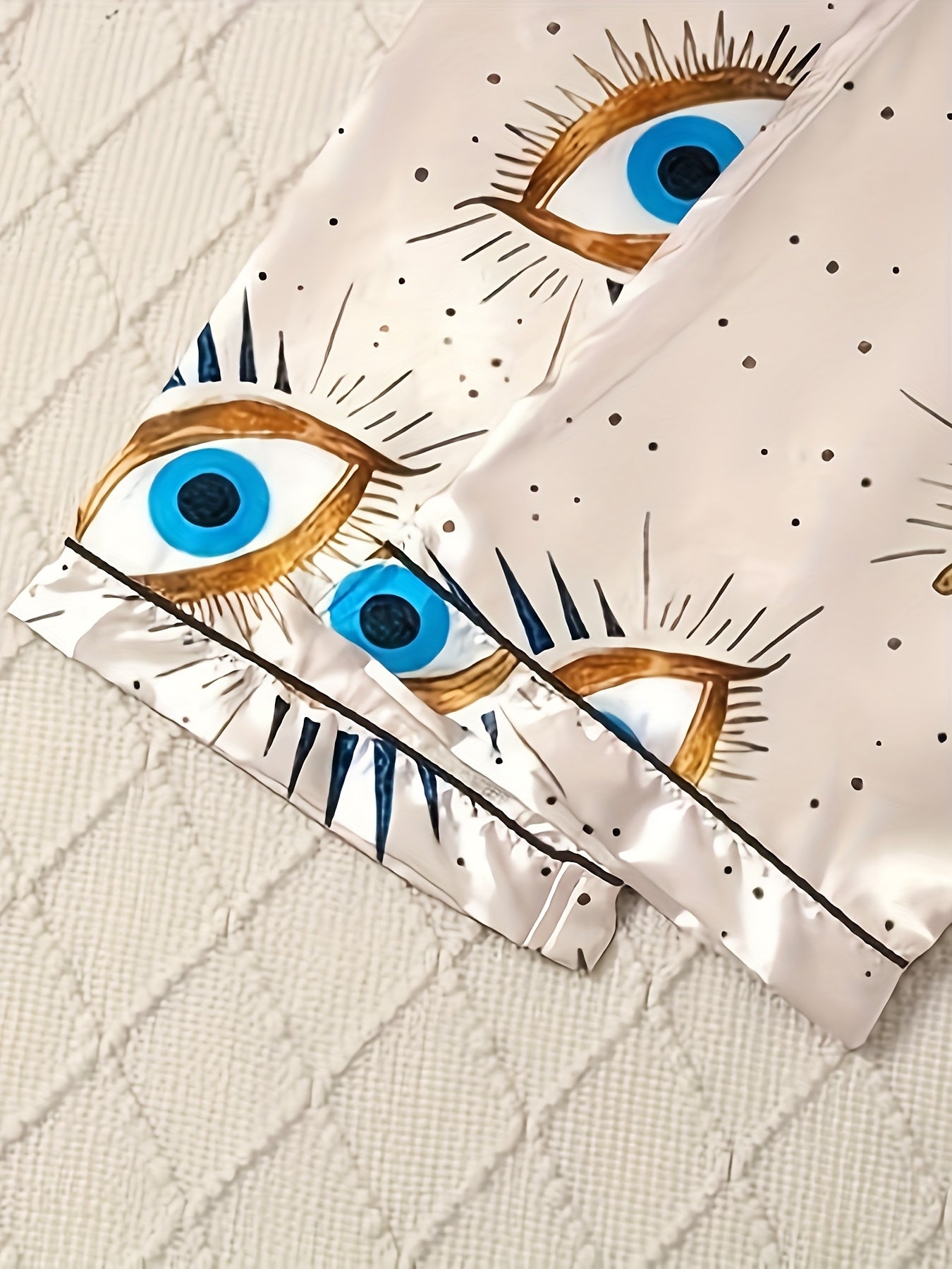 Add a touch of mystery to your nights with this eye-print 3-piece nightwear set, featuring a short-sleeve button-down shirt, elastic waist shorts, and full-length pajama pants. The cream base is decorated with striking blue and gold eye motifs with artistic lashes, giving a bold and unique vibe to your loungewear.
