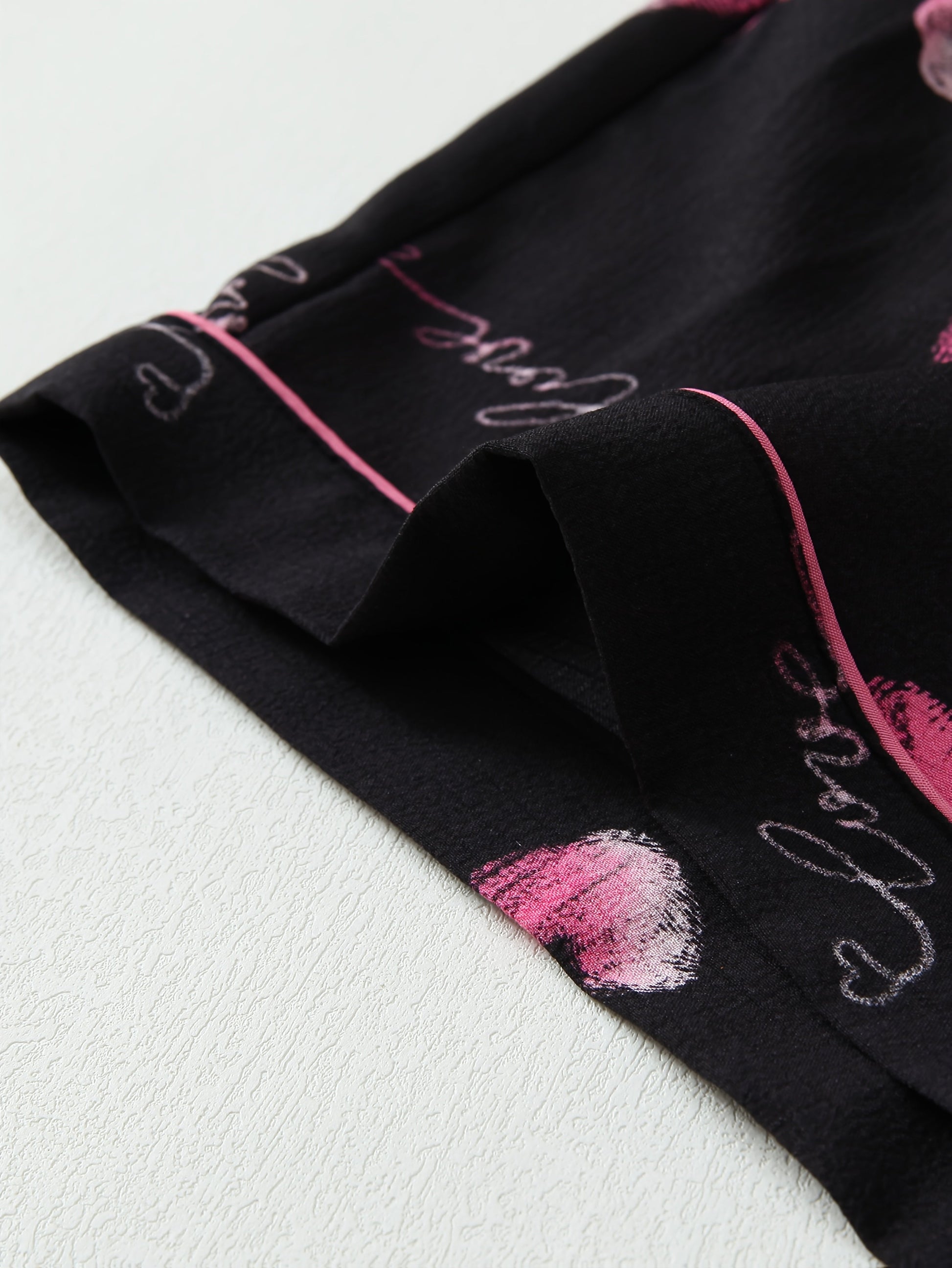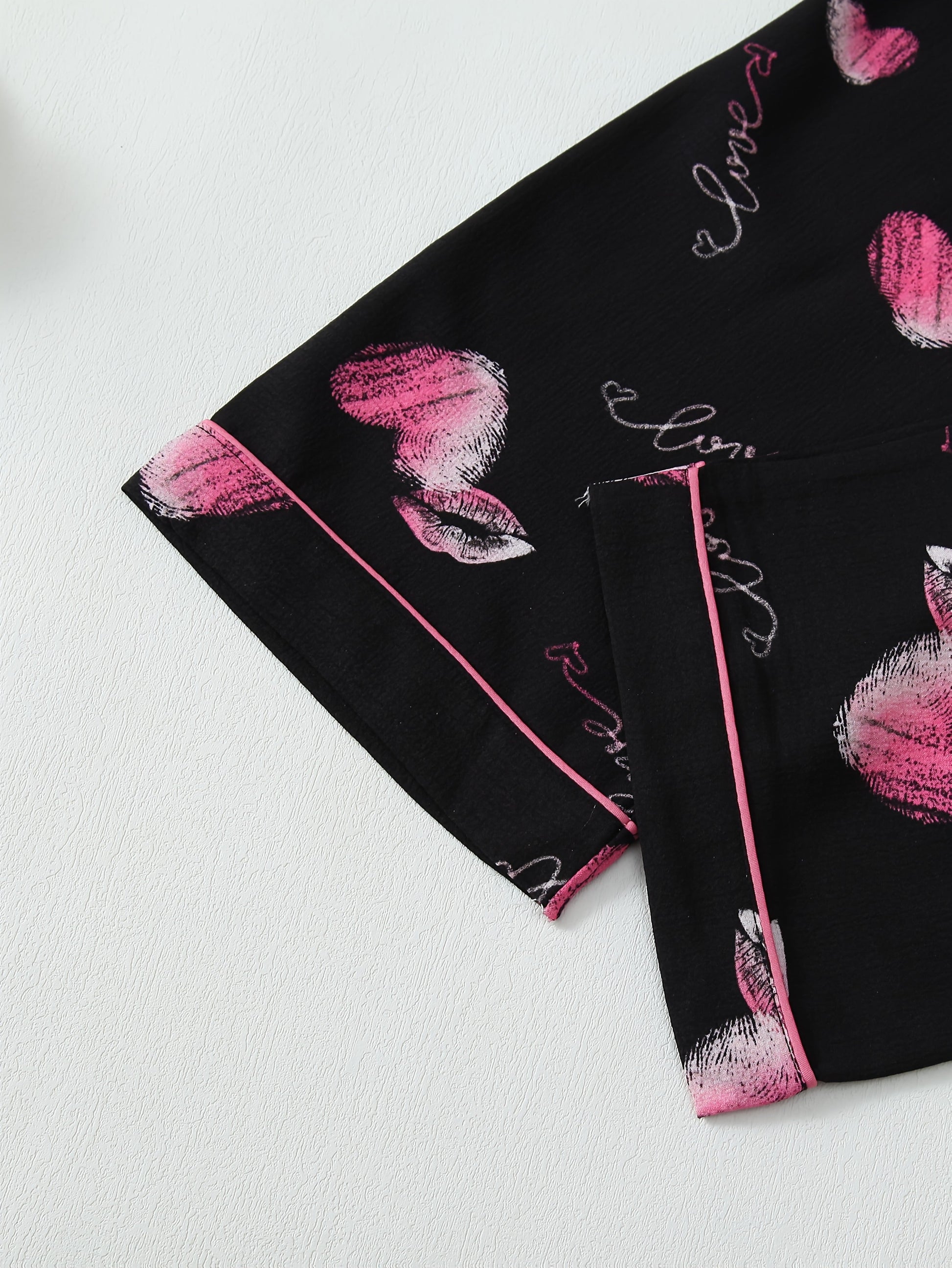 Turn nights into something unforgettable with this black pajama set covered in pink kiss marks, hearts, and love calligraphy. π The silky-soft fabric feels like a gentle hug on your skin, while the pink piping details and white satin bow ties add the perfect romantic charm.