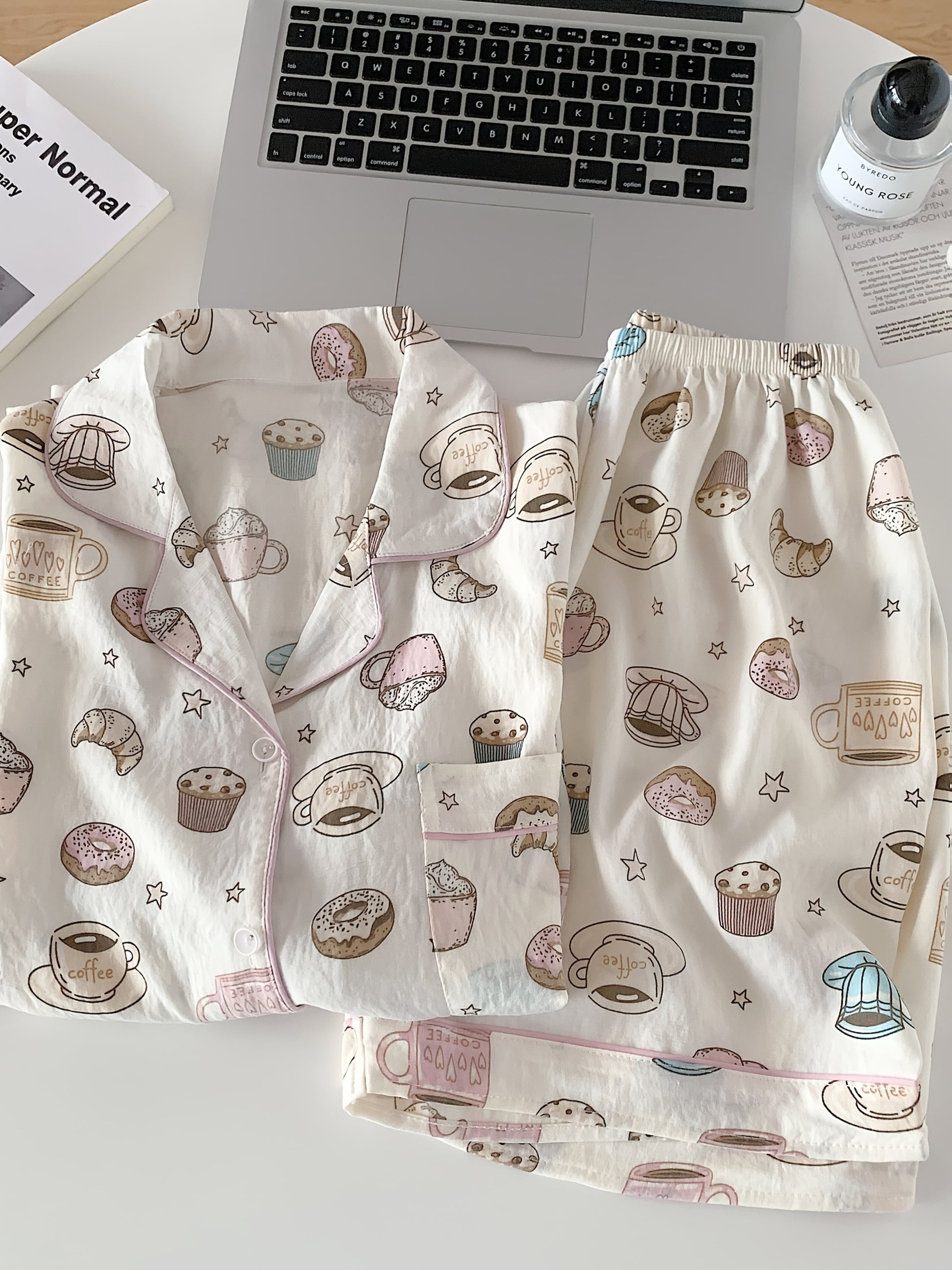 Coffee & Donuts Print Pajama Set – Shirt, Shorts & Pants